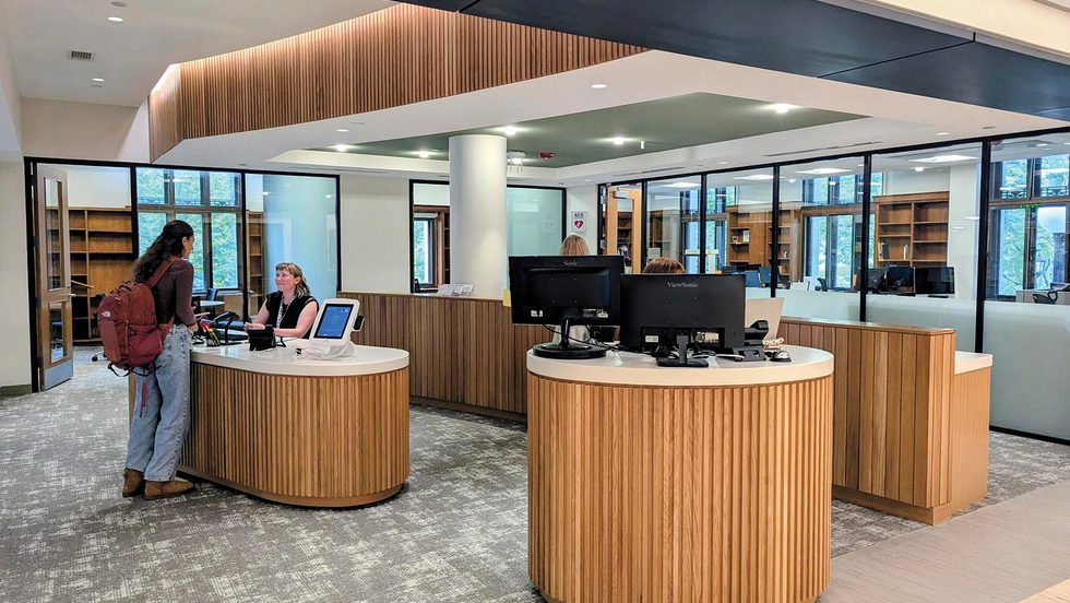 The Margaret Clapp Library reopened to the Wellesley community on Sept. 2 after 18 months of renovations. During the first days of the semester, students were already taking advantage of new study spots and services, including the redesigned public service desk, pictured at left. A feature on the Clapp renovation will appear in the spring magazine, after the final work on the library is done—including the creation of a new café on the first floor.
