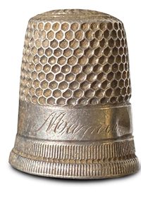 Digging Into History: The Wellesley College Hall Archaeology Project, a Davis Museum exhibition on view until Dec. 14, showcases artifacts uncovered by more than 100 Wellesley students, staff, and faculty members. From 2017 to 2022, former Wellesley anthropology faculty member Elizabeth Minor ’03, now an assistant professor of anthropology at California Polytechnic State University, led excavations on Severance Hill, the site of the 1914 College Hall fire. “By examining a single, transformative moment in the College’s history, this collaborative research offers new ways of thinking about memory, belonging, and how communities shape their narratives,” Minor wrote in the exhibition materials. Some of the dozens of artifacts on view include melted glass and boiled brick from the intense fire, a diode likely from the physics lab (the second in the nation for undergraduate students), a piece of a dining hall tray likely used as a sled, and this tiny silver thimble, inscribed “Mamie,” discovered by Megan Rodriguez-Hawkins ’25.