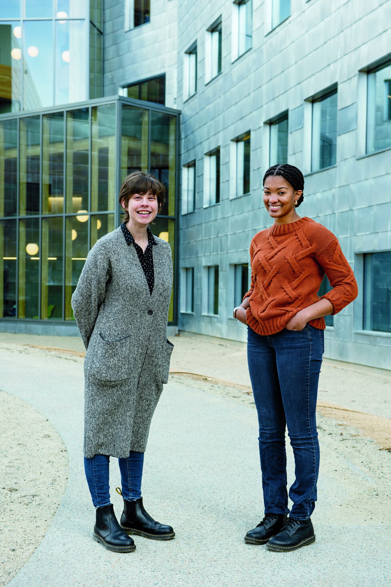 From College Road, the approach is familiar: A path that curves through a meadow leads to a set of shallow concrete stairs that carries you to the south entrance of the Science Complex, with its iconic exposed concrete frame and orange and blue ductwork. There’s a hint of changes to come with the new Amabel Boyce James ’74 Front Porch, located under the overhang of the 1977 L-wing, where students study and socialize outdoors. And once past the door, the transformation is obvious, and exhilarating. You immediately notice the light.