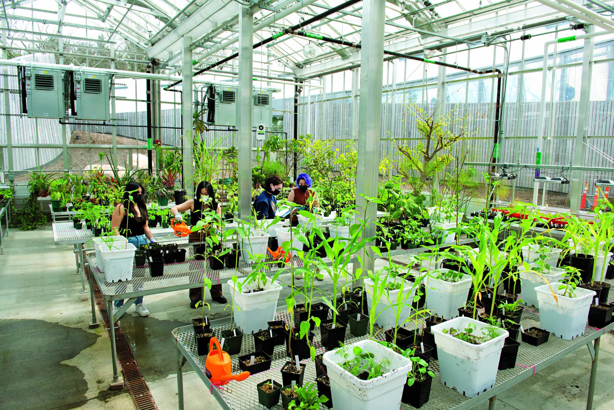 Unique setups and spaces abound in the Science Complex. Rachel Stanley, associate professor of chemistry, works with her students to build field-portable mass spectrometers that they use on research cruises to study the impact of climate change on oceans. She shares a lab with Griffith and Jaclyn Hatala Matthes, assistant professor of biological sciences, in the Chao Foundation Innovation Hub. “I love the idea of a joint lab. … We all are doing research related to the environment. Jackie studies forests, Alden studies plants, and I study water. It’s so exciting for the three of us to be together in a beautiful space that is open and encourages collaboration, because it means that not only do we as professors get to talk more, but our students all get to talk more,” Stanley says. “Our benches are right next to each other, which means that we can have more collaborations, more ideas. The students get exposed to more research.”